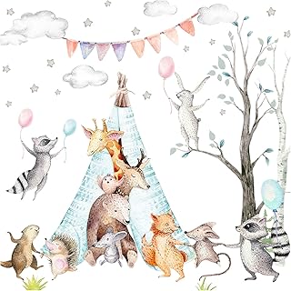 KAIRNE 102 Stück Waldtiere Baum Wandsticker,Bunt Wandtattoo für Kinderzimmer,Cartoon Tiere Wandaufkleber,DIY Eule Fuchs Dschungel Tiere Wandaufkleber für Junge Mädchen Schlafzimmer Babyzimmer Wanddeko
